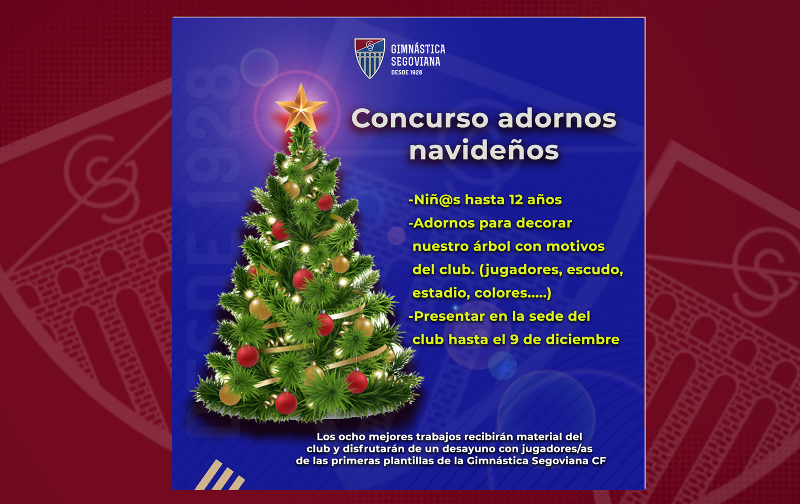 Un año más, la Gimnástica Segoviana organiza un concurso navideño destinado a los escolares de primaria de la provincia (niñ@s hasta los doce años). En esta ocasión, la Gimnástica plantea un concurso de adornos navideños, para decorar el árbol de las oficinas del club.